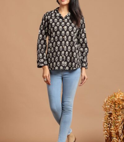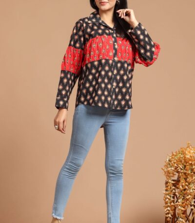 Black & Red Printed Long Sleeve Cotton Top for Women ? Stylish Casual Shirt Style